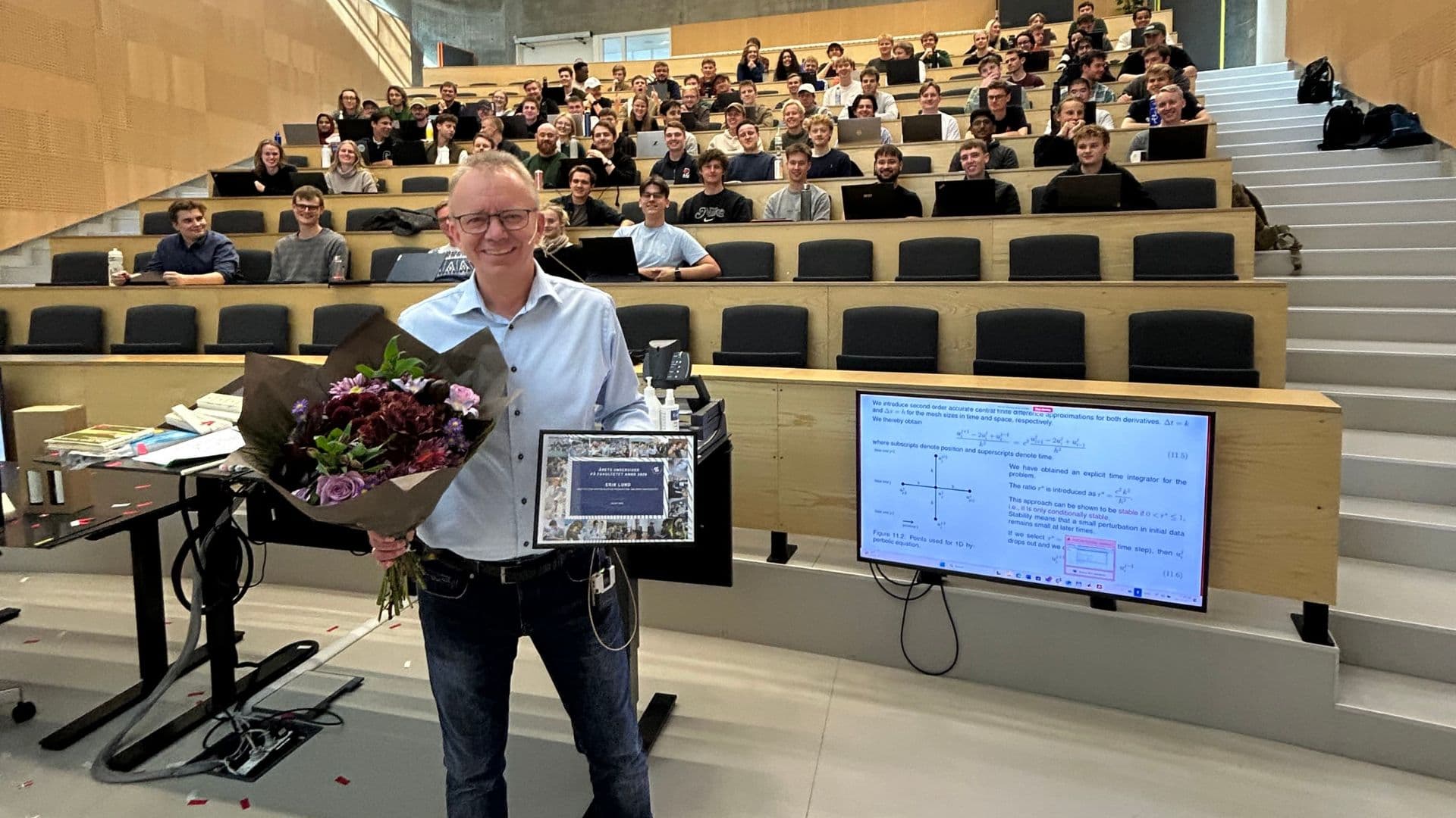 Det var et rørende øjeblik, da Erik Lund blev overrasket med prisen som årets underviser på Engineering 2025. Det skete på en ganske almindelig tirsdag, i et auditorium fuld af studerende hvor Erik, ganske som han plejer, stod midt i sin undervisning.
