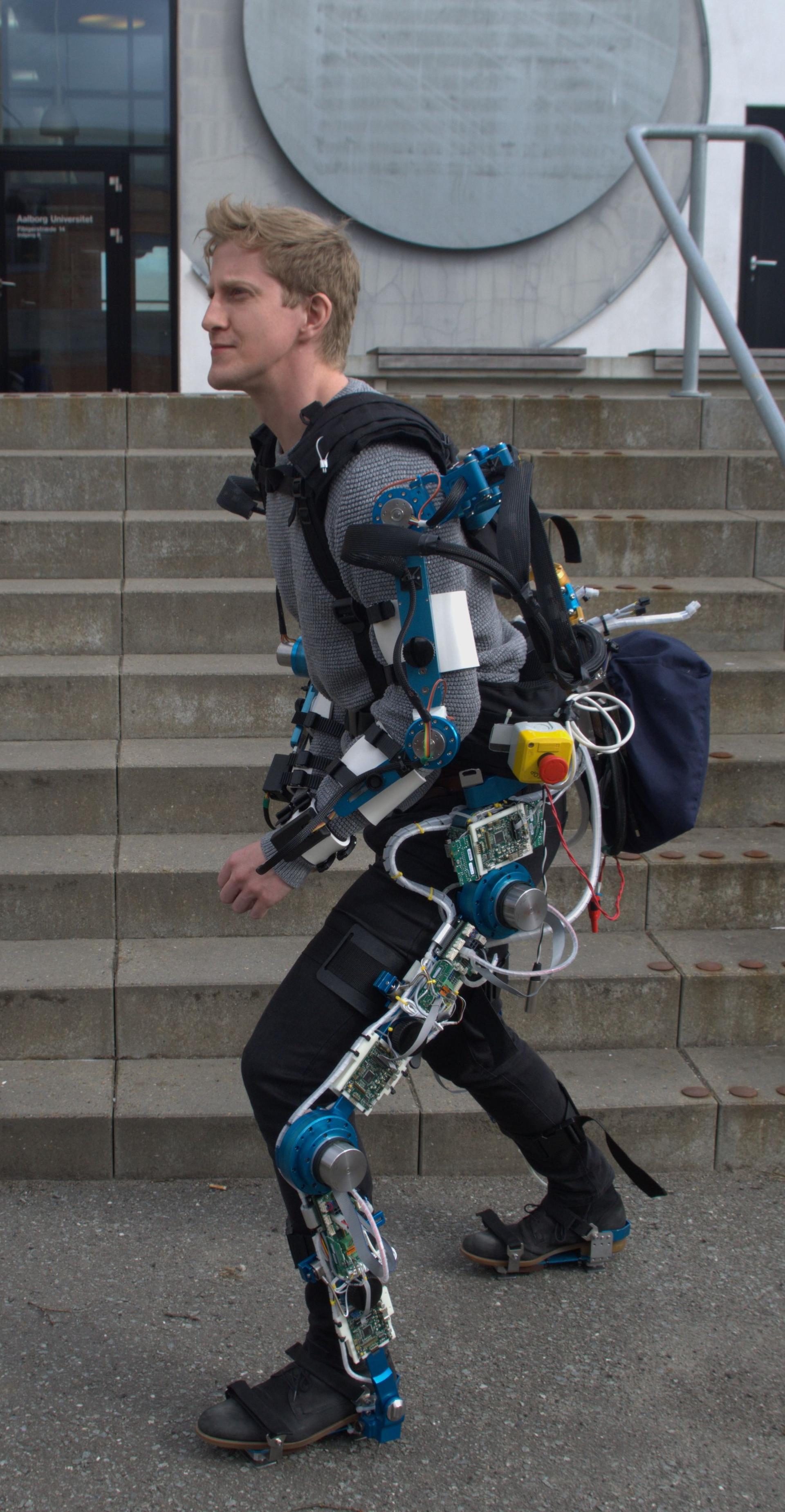 The lab has multiple exoskeletons at its disposal, both commercial exoskeletons, exoskeletons developed at AAU and exoskeletons combining both technology from AAU and commercial exoskeletons.
