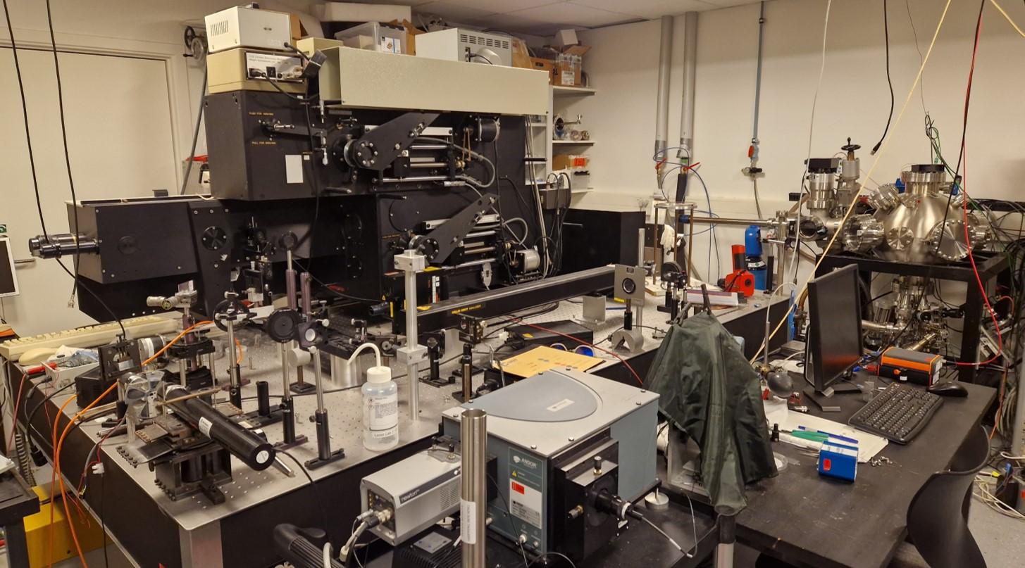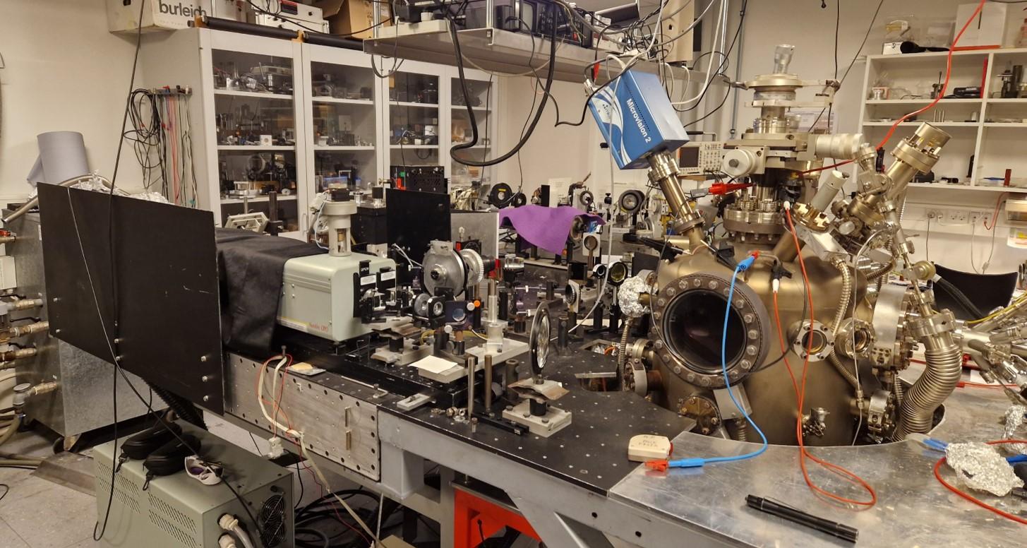 This is an image of the nanosecond pulsed laser setup for second-harmonic spectroscopy. The Vacuum chamber is for measurements under UHV conditions. This setup is primarily used for characterization of surfaces and interfaces, e.g., of thin films.