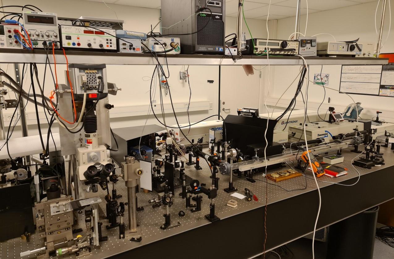 This is an image of the lab for non-linear optical spectroscopy and imaging. The femtosecond laser system is based on a “Tsunami” oscillator from Spectra-Physics combined with an “Integra-C” amplifier from Quantronics. A “TOPAS-C” optical parametric amplifier allow us to tune the wavelength of the 100fs pulses from near UV to near-IR. The system is being used for non-linear optical spectroscopy and imaging of semiconductors and nanostructured materials.