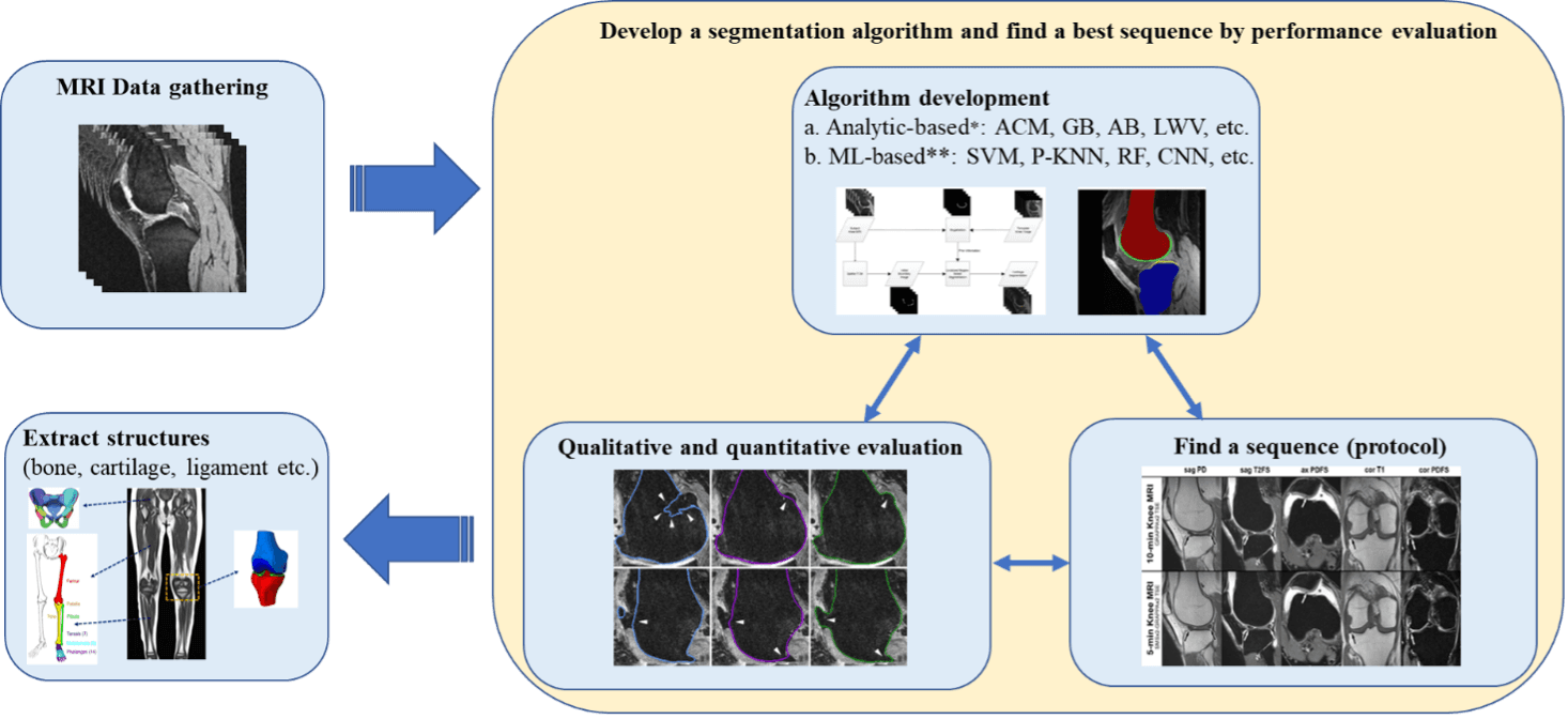 Therefore, this project aims to develop novel algorithms to automatically segment the musculoskeletal structure (bone, cartilage, ligament, etc.) of the lower extremities from magnetic resonance imaging (MRI) images. This project includes the development of segmentation algorithms and studies on correcting irregular signals of MRI images and selecting MRI sequences for the best segmentation performance. The ultimate goal of this project – the result of automatic segmentation of lower extremity musculoskeletal structures – will be essential in progressing the field of patient-specific modelling of knee OA patients.
