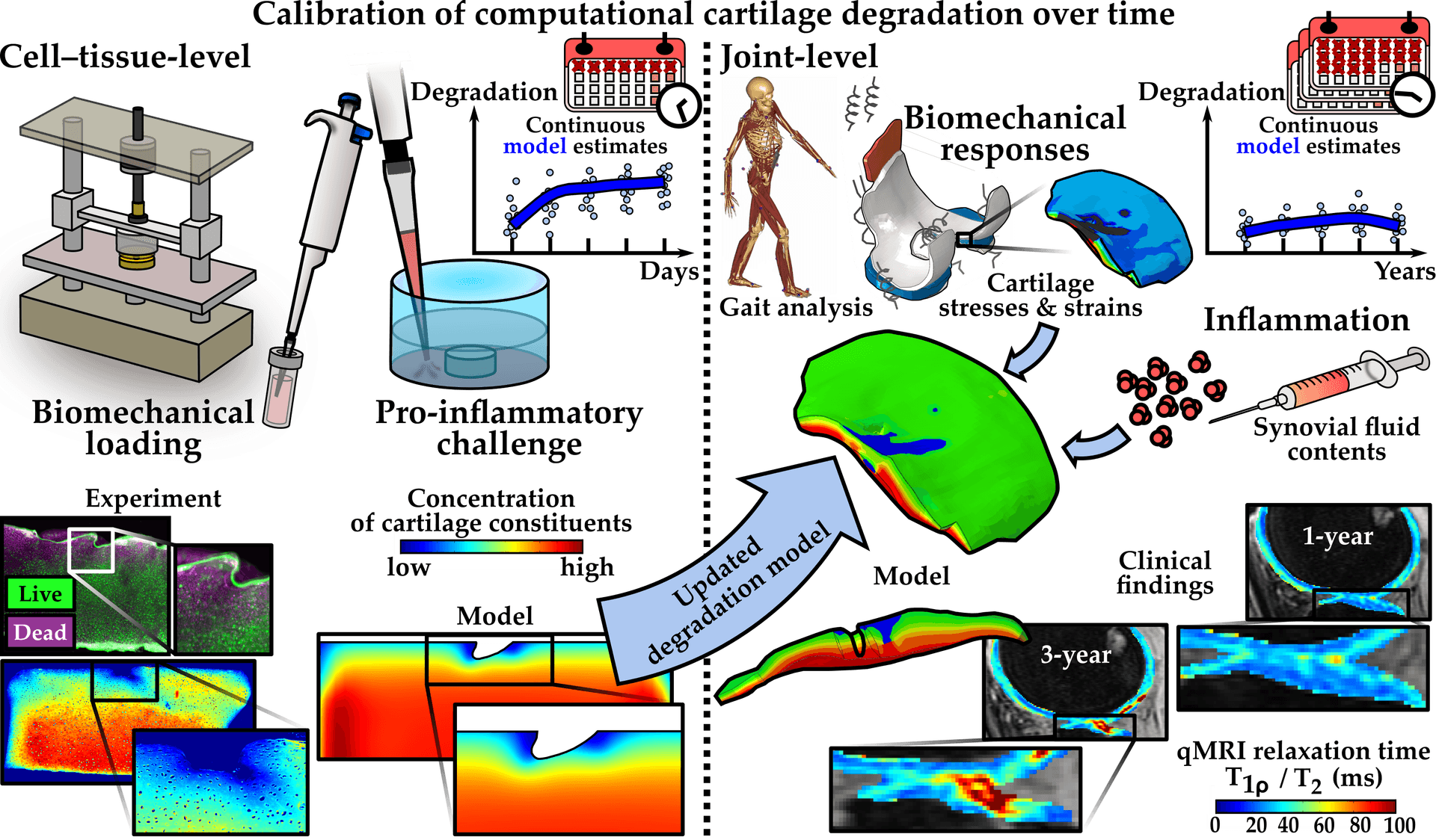 Second, he will introduce cell–tissue-level model enhancements into knee joint-level models, conducting another model calibration but with in vivo data, including from clinical osteoarthritis patients who have undergone anterior cruciate ligament reconstruction surgery. Gait analysis and inflammation via synovial fluid contents will estimate biomechanical joint responses, and quantitative Magnetic Resonance Imaging (qMRI) findings will calibrate the model estimates. The time-calibrated in vivo cartilage degradation models will serve as a basis for estimating, for example, biomechanical degradation timescales, mechanical stress levels below the degraded cartilage and the inflammatory state of the knee. Later, the MathKOA project will need these joint-level model outputs for mechanistic, simulated knee joint pain response predictions.